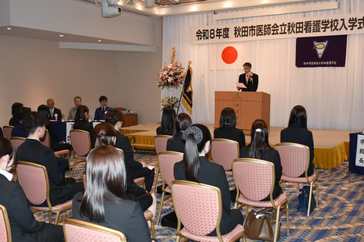 湊学校長のほかご来賓の沼谷純秋田市長や安藤秀明市立秋田総合病院病院長の式辞や祝辞では、専門科目は難しいので心して勉強すること、クラスメートを大切にすること、コミュニケーション能力を高めることなど、在学生時代に身につけ、頑張ってほしいことを優しく語りかけていただくとともに、3年後には全員が国家試験に合格し、看護の現場で活躍してほしいとエールを送っていただきました。新入生の皆さん、理想の看護師を目指し、充実した学生生活を送って国試合格を勝ち取れることを心から祈っています。
