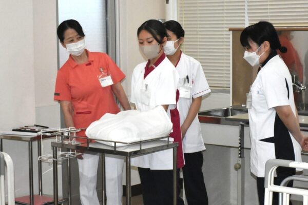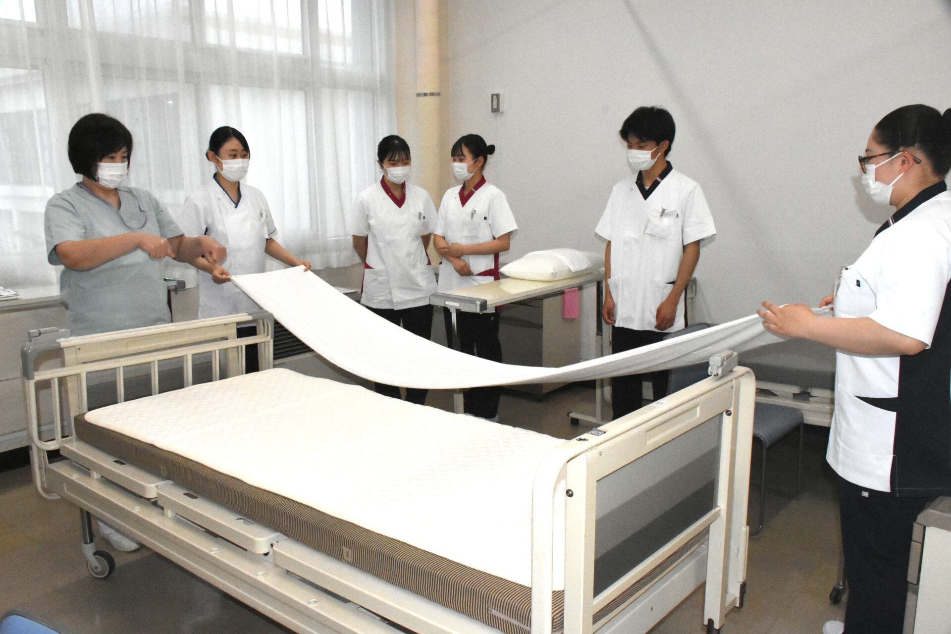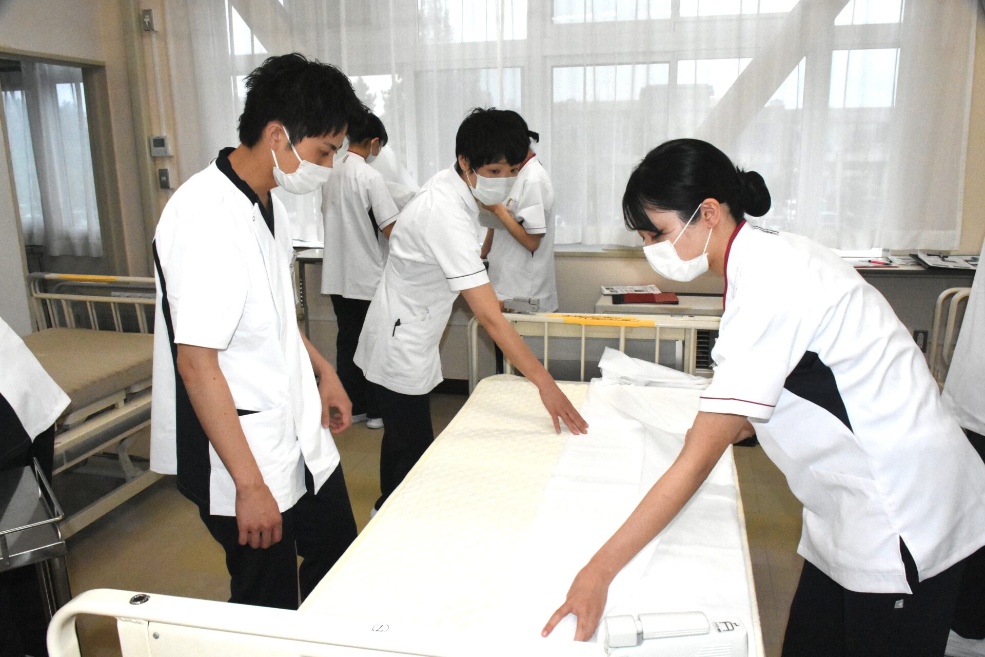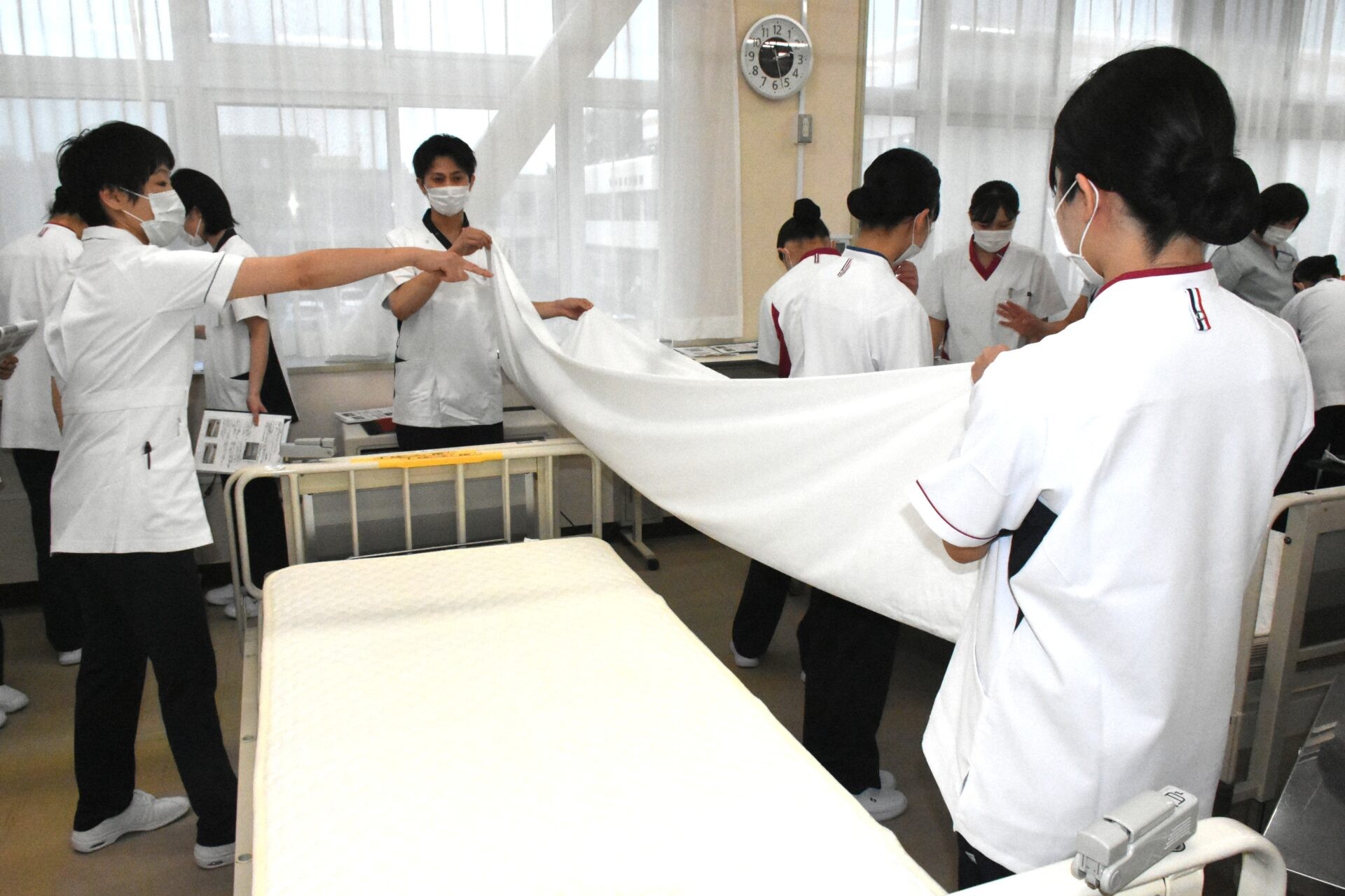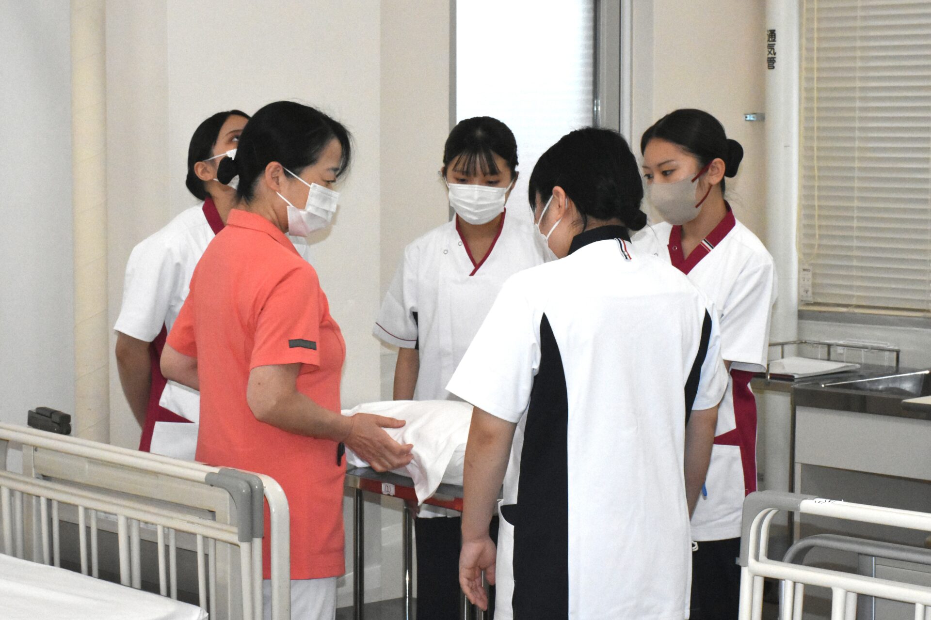 本校入学後、初めての看護ケアに直結する演習が「ベッドメーキング」。枕カバーの整え方に始まり、ベッド用のシーツの敷き方については特に念入りな指導を受け、患者さんが気持ちよく養生できよう、グループで声を掛け合いながら何度も繰り返して練習していました(写真は令和6年度)。