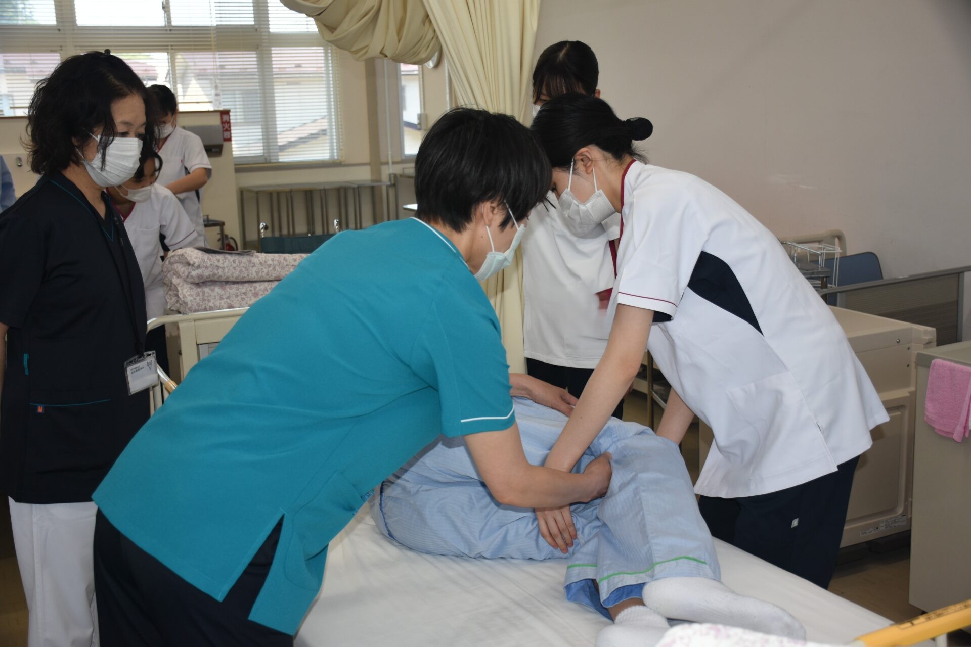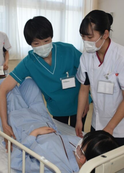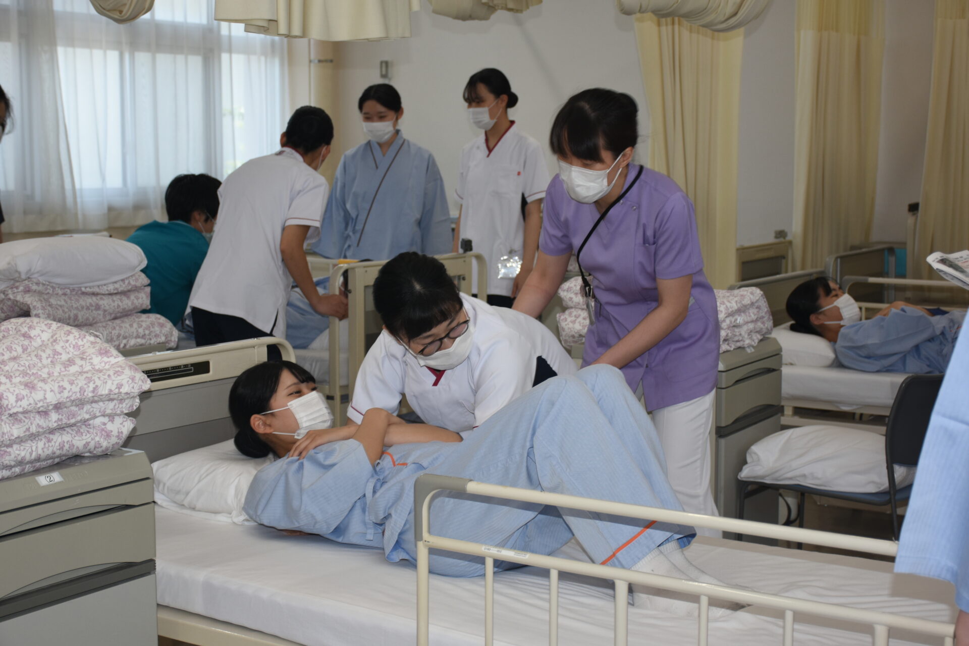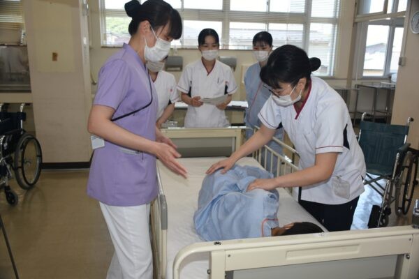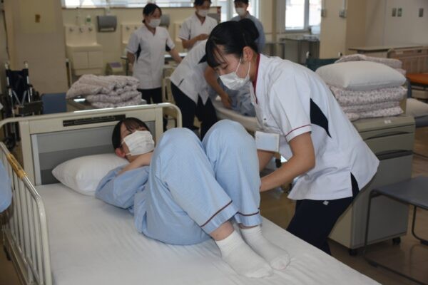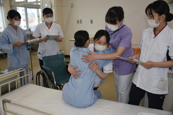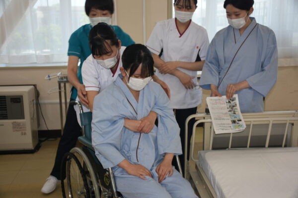 ■体位変換・移乗(令和7年6月13日) 6月13日、1年次生達が「体位変換・車椅子移乗」の看護技術を身につけるための演習を行いました。この演習は、入院中の患者さんの褥瘡の予防や快適な療養生活などに役立てることが狙い。教員の熱心な指導の下、全員真剣に取り組んでいました。