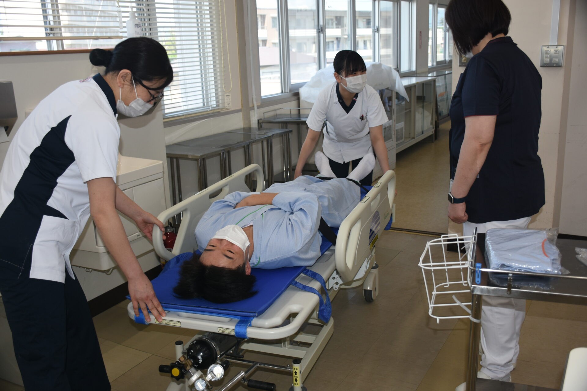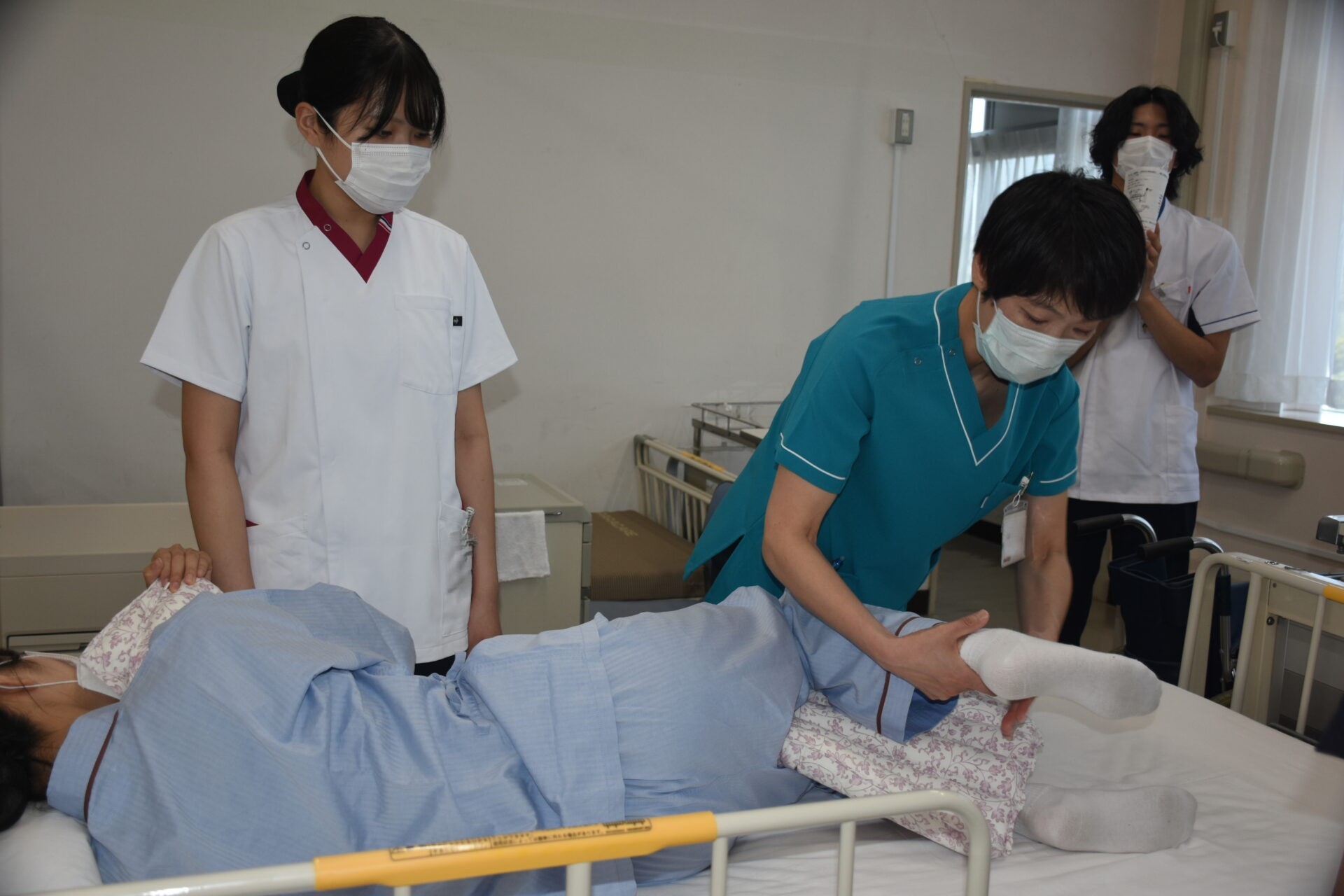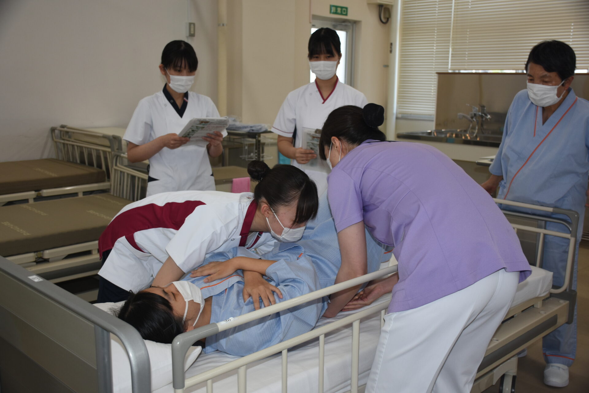 ■体位変換・移乗(令和7年6月13日) 6月13日、1年次生達が「体位変換・車椅子移乗」の看護技術を身につけるための演習を行いました。この演習は、入院中の患者さんの褥瘡の予防や快適な療養生活などに役立てることが狙い。教員の熱心な指導の下、全員真剣に取り組んでいました。