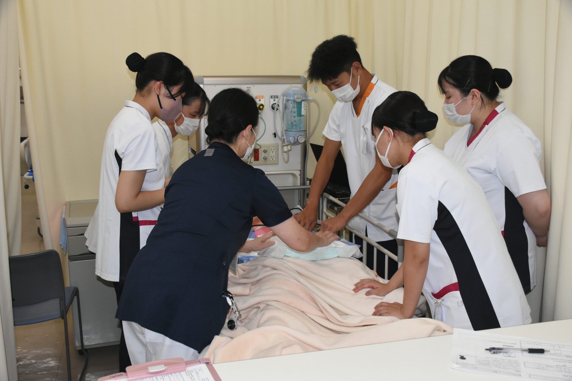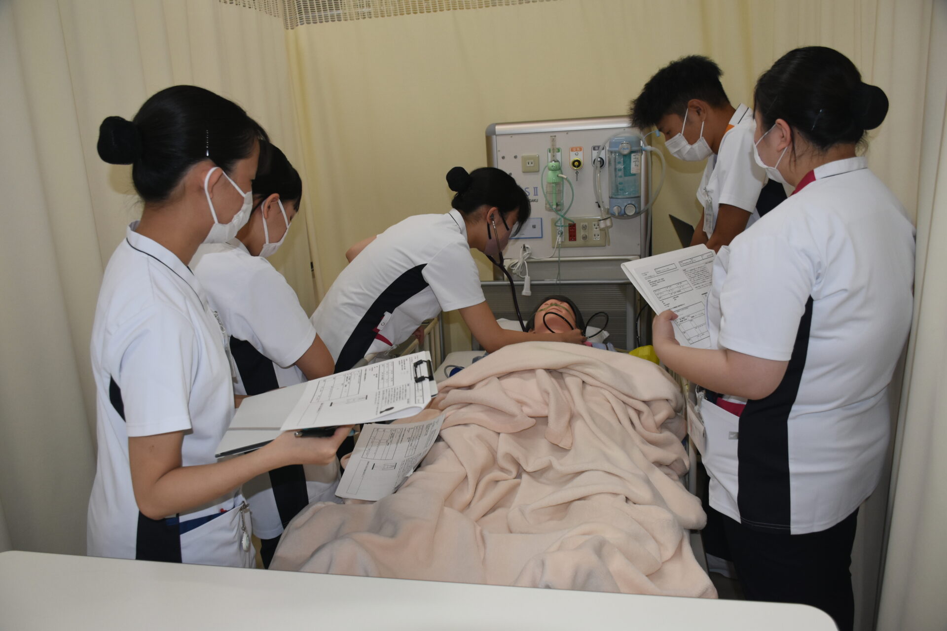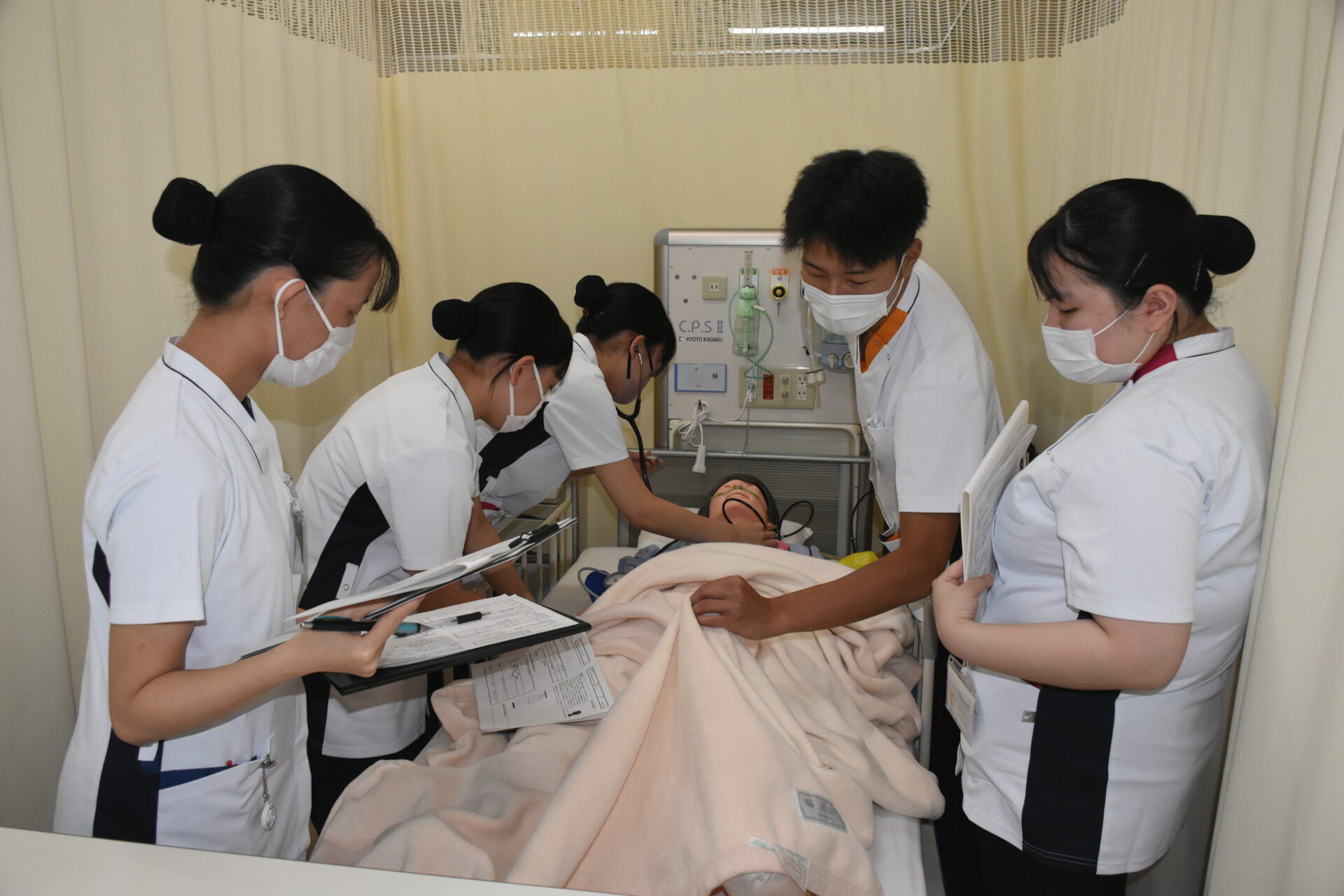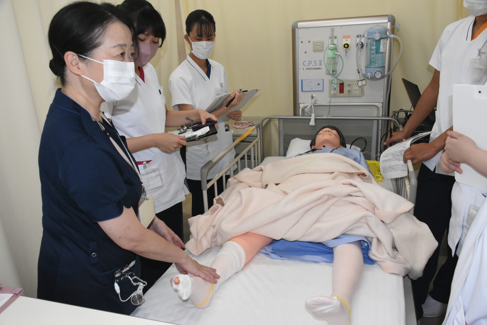 2年次生の授業科目「成人・老年期の生命の危機にある人の看護」では、フィジカルアセスメントモデル人形を使って、手術後の患者さんの状況判断をするための演習をします。5人ほどのグループで行いますが、全員が触診したり聴診器を使ったりしながらスキルアップに努めています。