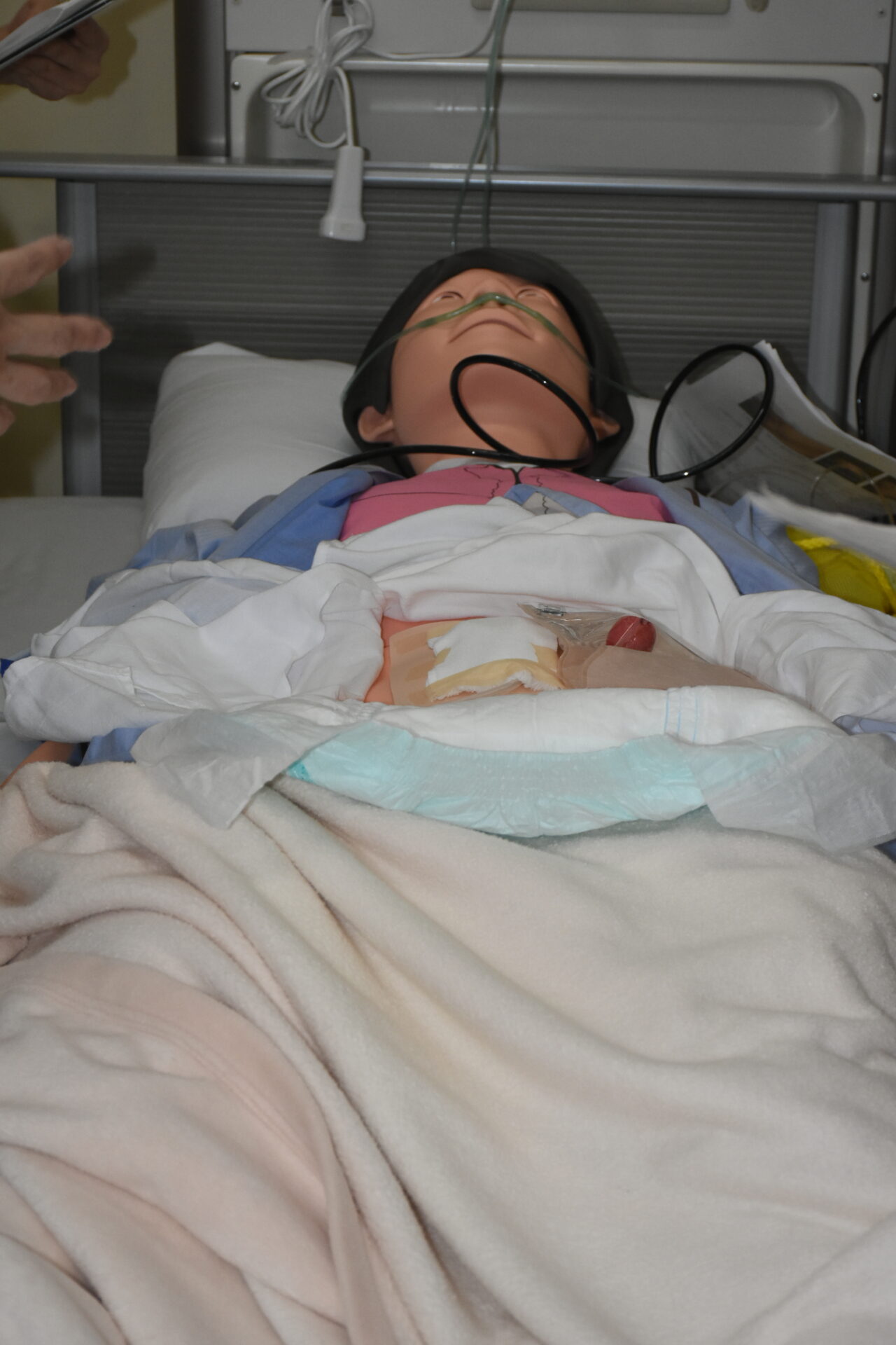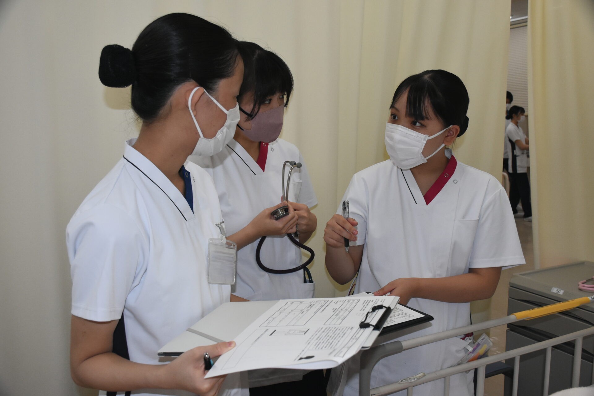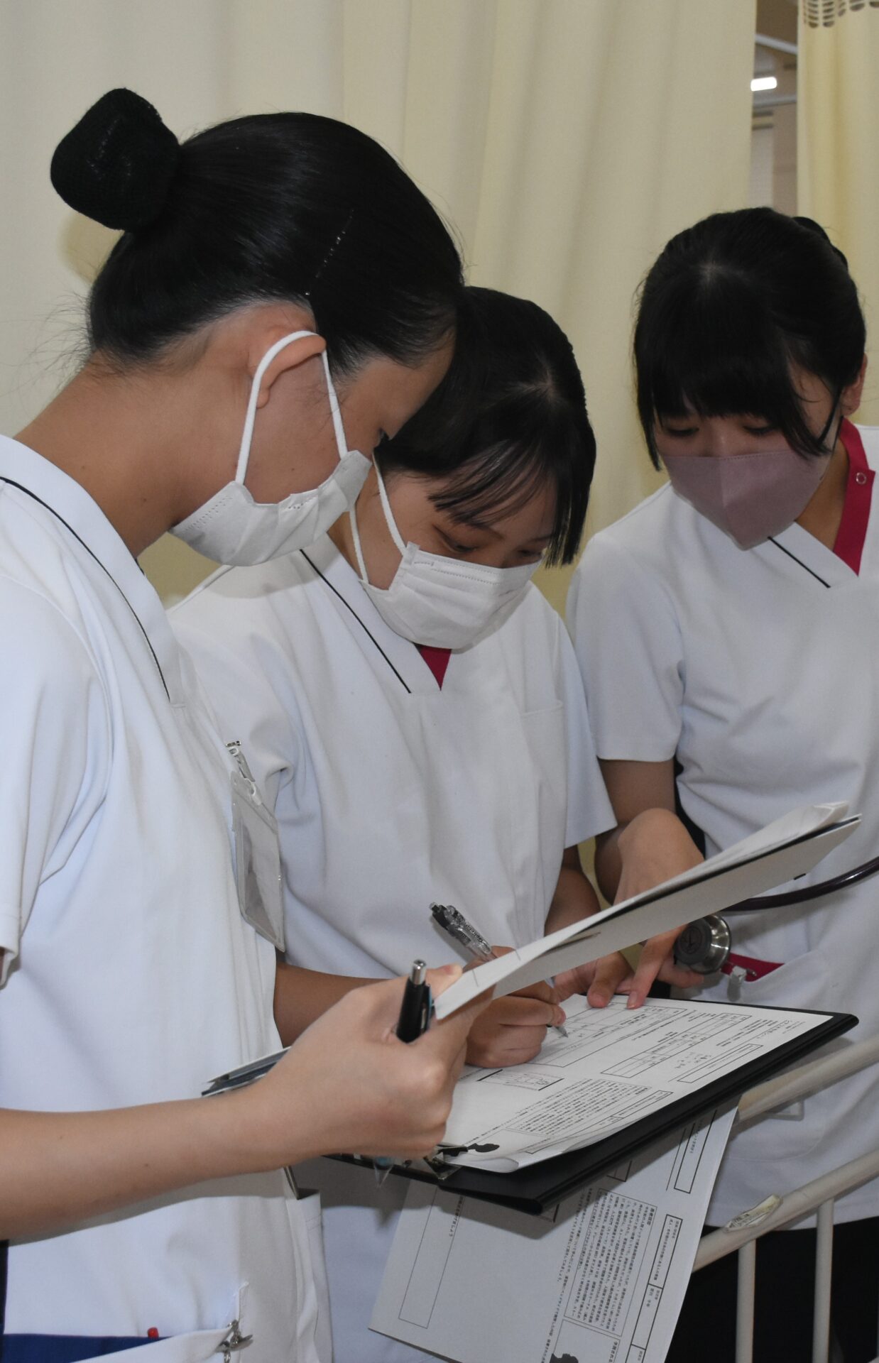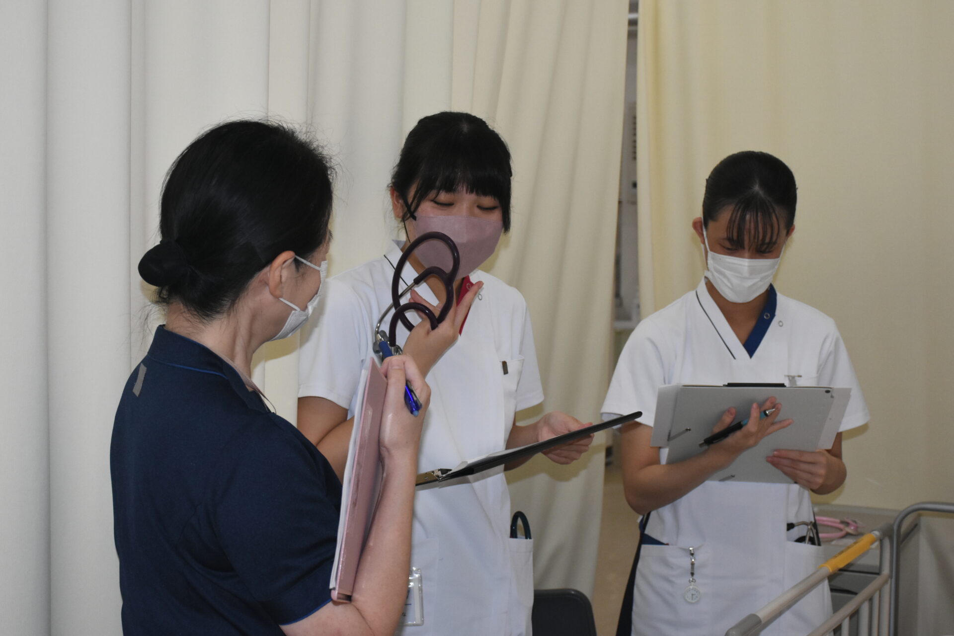 2年次生の授業科目「成人・老年期の生命の危機にある人の看護」では、フィジカルアセスメントモデル人形を使って、手術後の患者さんの状況判断をするための演習をします。5人ほどのグループで行いますが、全員が触診したり聴診器を使ったりしながらスキルアップに努めています。